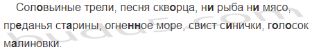 Сол..вьиные трели, песня скв..рца, н.. рыба н.. мясо, пр..данья ст..рины, огне(н, нн)ое море, свист с..нички, г..л..сок м..линовки.