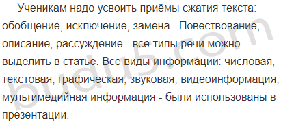 Виды информации (числовая, текстовая, графическая, звуковая, видеоинформация, мультимедийная информация). Приёмы сжатия текста (обобщение, исключение, замена). Типы речи (повествование, описание, рассуждение).