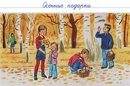 ♦ Рассмотри, что изображено на рисунке. Можно ли его назвать: "Осень в парке", "На прогулке", "Осенние радости"? Придумай и запиши своё название.