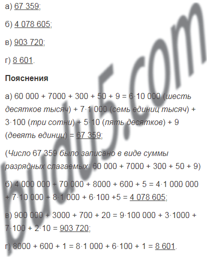 а) 60 000 + 7000 + 300 + 50 + 9;