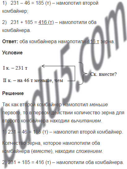 Один комбайнёр намолотил 231 т зерна, а второй — на 46 т меньше. Сколько зерна намолотили оба комбайнёра?