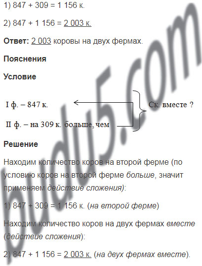 На одной ферме 847 коров, а на другой — на 309 коров больше. Сколько коров на двух фермах?