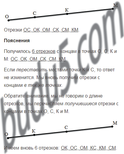 Начертите отрезок ОМ и отметьте на нём точки С и К. Запишите все получившиеся отрезки с концами в точках О, С, К и М.
