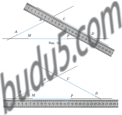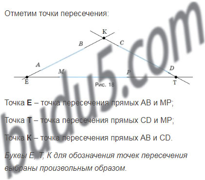 С помощью линейки найдите на рисунке 18 точки пересечения прямых АВ и MP, CD и MP, AВ и CD.