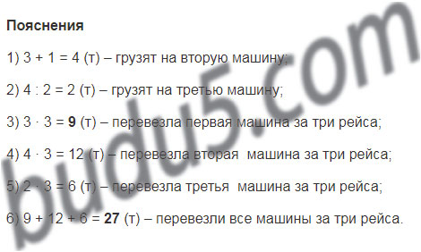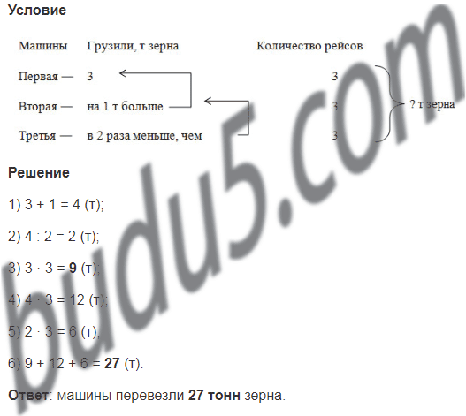 Для перевозки зерна выделили три машины. На одну из них грузили по 3 т зерна, на вторую — на 1 т больше, чем на первую, а на третью машину — в 2 раза меньше зерна, чем на вторую. Сколько зерна перевезли эти машины, сделав по три рейса каждая?