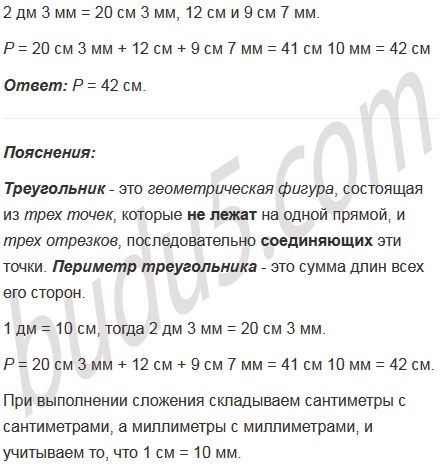 Найдите периметр треугольника, стороны которого равны 2 дм 3 мм, 12 см и 9 см 7 мм.