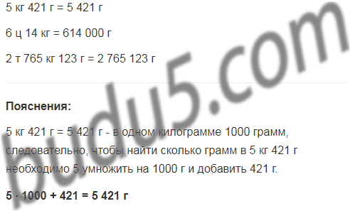 Выразите в граммах: 5 кг 421 г; 6 ц 14 кг; 2 т 765 кг 123 г.