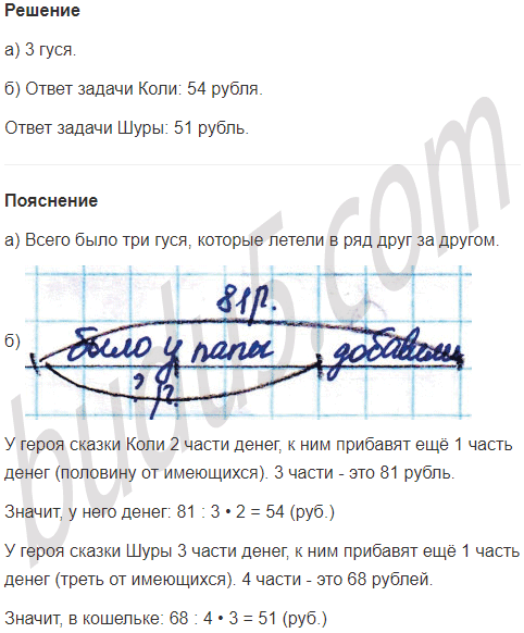 Коля прочитал вот что: "Если к моим деньгам прибавить их половину, то получится 81 рубль. Сколько у меня денег?". А Шура прочитала вот что: "Если мама положит в кошелёк ещё треть денег, находящихся в нём, то в кошельке станет 68 рублей. Сколько денег в кошельке?"