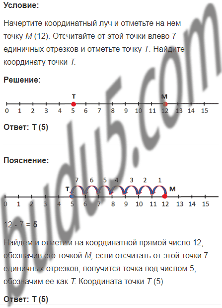 Начертите координатный луч и отметьте на нем точку M (12). Отсчитайте от этой точки влево 7 единичных отрезков и отметьте точку T. Найдите координату точки T.