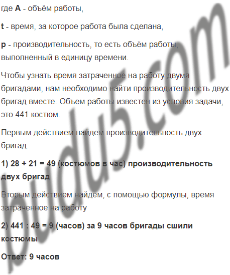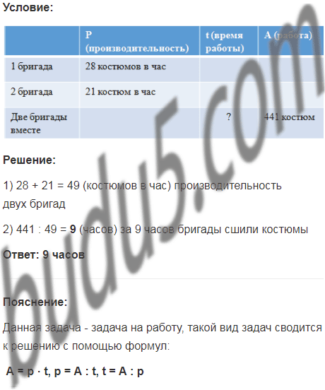 Две бригады сшили 441 детский костюм, работая вместе. Первая бригада изготавливала 28 костюмов в час, а вторая - 21 костюм в час. Сколько часов бригады шили костюмы?