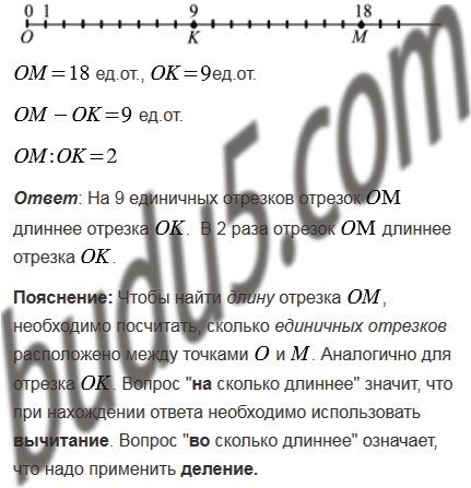 На координатном луче отмечены точки О(0), М(18), К(9). На сколько единичных отрезков отрезок ОМ длиннее отрезка ОК? Во сколько раз отрезок ОМ длиннее отрезка ОК?