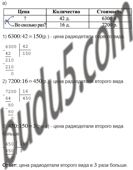 1) Стоимость 42 радиодеталей одного вида 6300 р., а стоимость 16 радиодеталей другого вида 7200 р. Цена какой детали больше и во сколько раз?