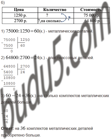 2) Ремонтная мастерская приобрела комплекты металлических и пластмассовых деталей для велосипедов. Комплектов металлических деталей по цене 1250 р. куплено на сумму 75 000 р., а пластмассовых по цене 2700 р. - на сумму 64 800 р. каких комплектов деталей приобретено больше и насколько больше?