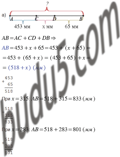 а) AB, если AC = 453 мм, CD = x мм и DB = 65 мм. Найдите значение получившегося выражения при x = 315; 283.