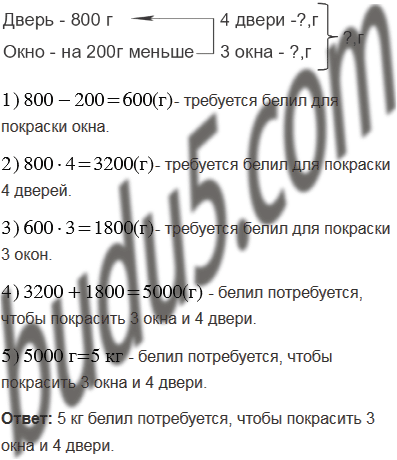 Для покраски двери требуется 800 г белил, а для покраски окна на 200 г меньше. Сколько белил потребуется, чтобы покрасить 3 окна и 4 двери?