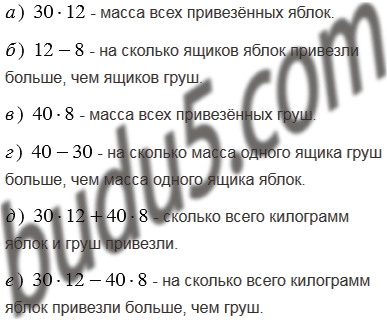 Привезли 12 ящиков яблок, по 30 кг в каждом, и 8 ящиков груш, по 40 кг в каждом. Какой смысл имеют следующие выражения: