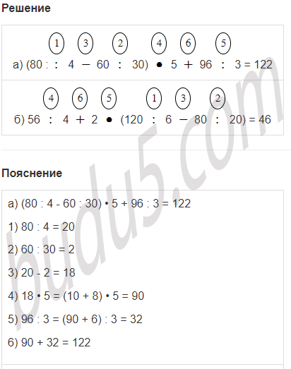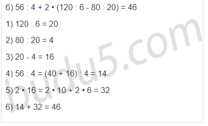 | а) (80 : 4 - 60 : 30) • 5 + 96 : 3 | б) 56 : 4 + 2 • (120 : 6 - 80 : 20) |