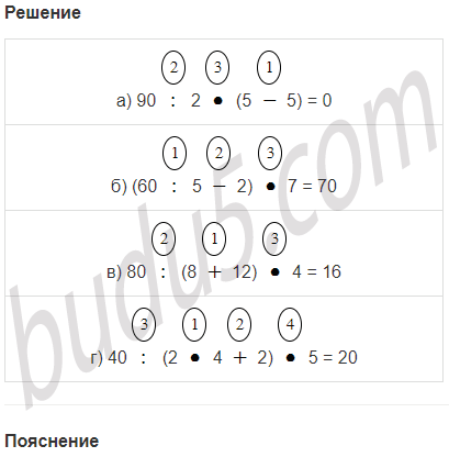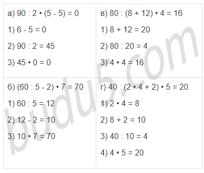 | а) 90 : 2 • 5 - 5 = 0 | в) 80 : 8 + 12 • 4 = 16 |