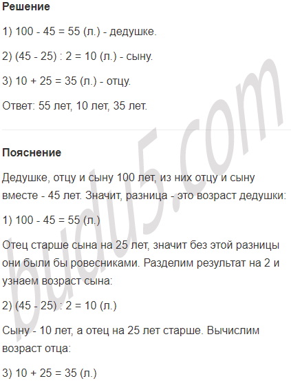 Один господин встретил знакомую семью, состоящую из деда, отца и сына, и спросил, сколько им лет. "Нам всем вместе 100 лет", - ответил за всех дед. Тогда господин спросил отца: "Скажите же, сколько вам лет?" - "Мне вместе с сыном 45 лет, - ответил отец, - а сын на 25 лет моложе меня". Так любопытному господину и не пришлось узнать, сколько лет каждому из них. Не сообразишь ли ты?