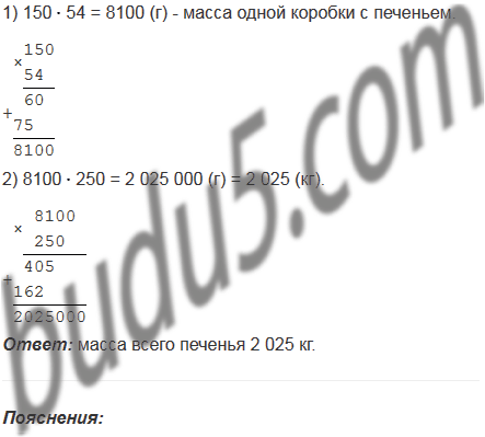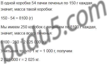 В магазин привезли 250 коробок, в каждой коробке по 54 пачки печенья. Какова масса всего печенья, если масса одной пачки 150 г?