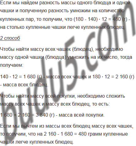 Масса чашки 140 г, а масса блюдца 180 г. Купили 12 чашек с блюдцами. Сколько весит эта покупка? На сколько купленные чашки легче купленных блюдец?