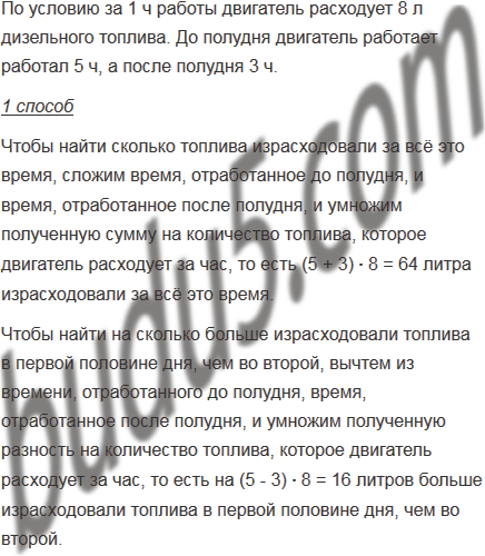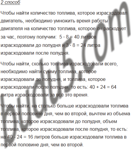 За 1 ч работы двигатель расходует 8 л дизельного топлива. До полудня двигатель работал 5 ч, а после полудня 3 ч. Сколько литров дизельного топлива израсходовали за всё это время? На сколько больше израсходовали топлива в первой половине дня, чем во второй?