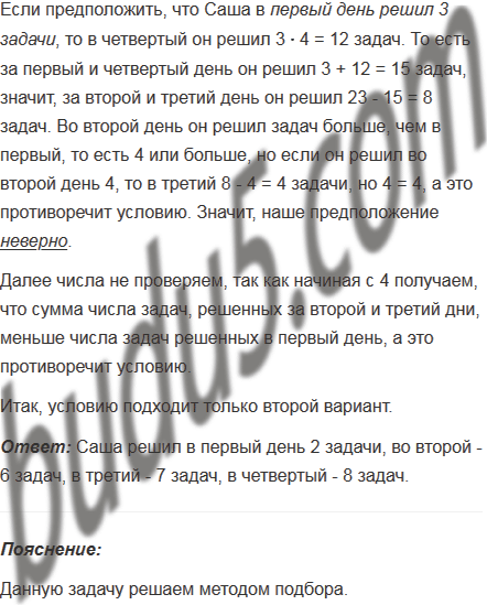 Саша любит решать трудные задачи. Он рассказал, что за 4 дня смог решить 23 задачи. В каждый следующий день он решал больше задач, чем в предыдущий, и в четвёртый день решил вчетверо больше, чем в первый. Сколько задач решил Саша в каждый из этих четырёх дней?
