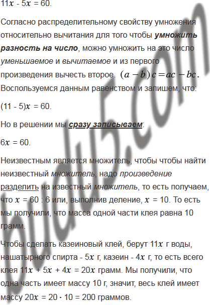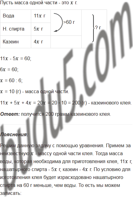 Чтобы сделать казеиновый клей, берут 11 частей воды, 5 частей нашатырного спирта и 4 части казеина (по массе). Сколько получится казеинового клея, если на него будет израсходовано нашатырного спирта на 60 г меньше, чем воды?