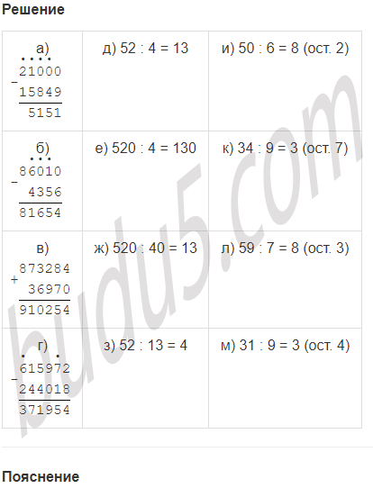 | а) 21000 - 15849 | д) 52 : 4 | и) 50 : 6 |