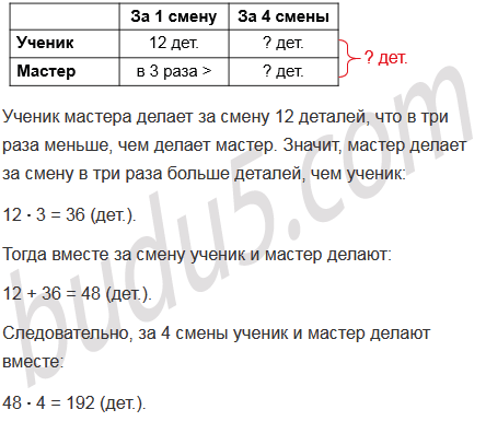 Ученик мастера делает за смену 12 деталей, что в три раза меньше, чем делает мастер. Сколько деталей они сделают вместе за 4 смены?