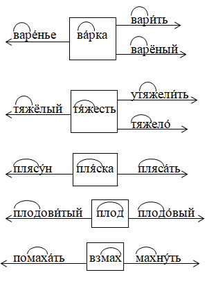 Найдите проверочное слово для каждой группы слов, расположите его в круге. Остальные слова расположите вдоль стрелок. В словах выделите корень и поставьте ударение.