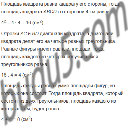 Постройте квадрат АВСD со стороной 4 см и проведите в нем отрезки АС и ВD. Чему равна площадь каждого из четырех получившихся треугольников?