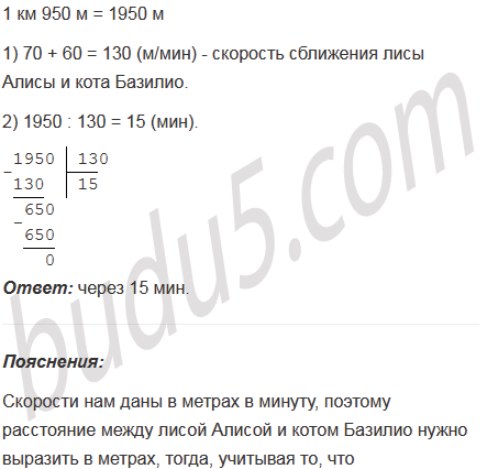 Лиса Алиса и кот Базилио идут навстречу друг другу сейчас между ними 1 км 950 м. Через сколько минут они встретятся, если лиса Алиса идет со скоростью 70 м/мин, а кот Базилио - со скоростью 60 м/мин?