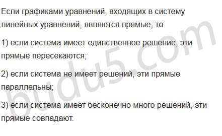 Вспомните, каким может быть взаимное расположение прямых, являющихся графиками двух линейных уравнений с двумя переменными, составляющих систему уравнений, в зависимости от того, сколько решений имеет эта система.