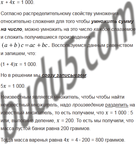 На одной чашке весов стоит банка с вареньем, а на другой - гиря в 1 кг. Весы находятся в равновесии. Сколько граммов варенья находится в банке, если пустая банка легче варенья в 4 раза?