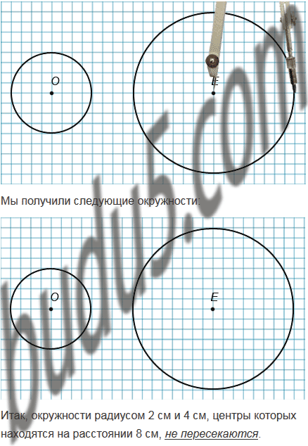 Отметьте точки О и Е так, чтобы ОЕ = 8 см. Постройте окружность с центром О и радиусом 2 см и окружность с центром Е и радиусом 4 см. Пересекаются ли эти окружности?