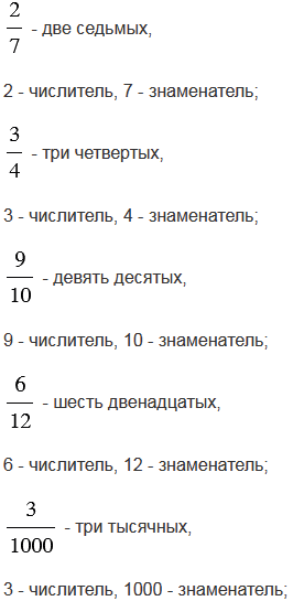 Прочитайте дроби: . Назовите числитель и знаменатель каждой дроби.