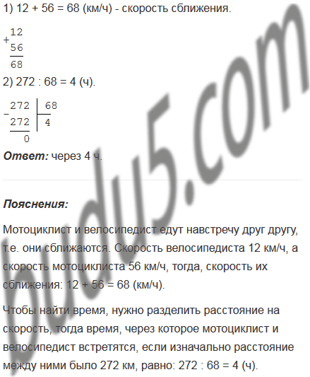 Мотоциклист и велосипедист едут навстречу друг другу. Через сколько часов они встретятся, если расстояние между ними 272 км, скорость велосипедиста 12 км/ч, а скорость мотоциклиста 56 км/ч?
