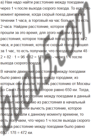 Из Санкт-Петербурга в Москву вышел торговый поезд со скоростью 48 км/ч, а через час после этого из Москвы в Санкт-Петербург вышел скорый поезд со скоростью 82 км/ч. Найдите расстояние между поездами: