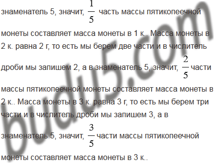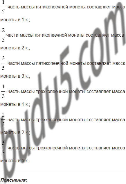 Массы монет выпуска 1961 г. в 1 к., 2 к., 3 к. и 5 к. были равны соответственно 1 г, 2 г, 3 г и 5 г. Какую часть массы пятикопеечной монеты составляет масса каждой из остальных монет? Какую часть массы трёхкопеечной монеты составляет масса каждой из остальных монет?