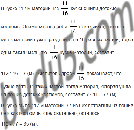 В куске 112 м материи. Из куска сшили детские костюмы. Сколько метров материи осталось?
