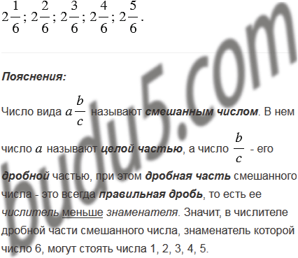 Запишите все числа, у которых целая часть 2, а знаменатель дробной части 6.