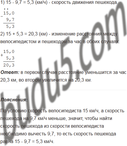 Скорость велосипедиста 15 км/ч, а скорость пешехода на 9,7 км/ч меньше. На сколько уменьшится расстояние между ними за 1 ч, если они движутся навстречу друг другу? На сколько увеличивается расстояние между ними за 1 ч, если они движутся из одной точки в противоположные стороны?