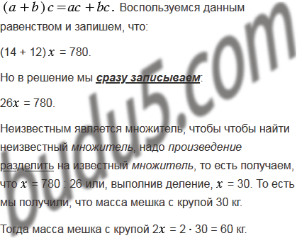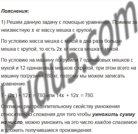 1) На машину погрузили 7 одинаковых мешков с мукой и 12 одинаковых мешков с крупой. Масса мешка с мукой в два раза больше мешка с крупой. Найдите массу мешка с мукой и мешка с крупой, если всего на машину погрузили 780 кг.
