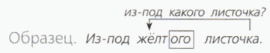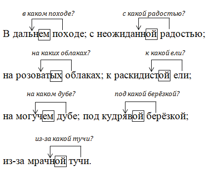 В (дальний) походе; с (неожиданная) радостью; на (розоватые) облаках3; к (раскидистая) ели; на (могучий) дубе; под (кудрявая) берёзкой; из-за (мрачная) тучи.