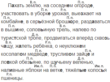 П..хать землю, на соседн..м3 огород.., уча(?)ствовать в уборк.. урожая, вые..жает на комбайн.., в сер(?)ёзной брош..ре2, разд..ваться в выш..не, солов(?)иную трель, налево по турис(?)ской тропе, продвигаться вперёд скво..ь ч..щу, ж..леть ребёнка, о неуклюж..м косолап..м медвед.., труслив..м зайц.. и ло..кой обез(?)яне, по щ..чьему веленью, нал..вные яблоки на ветк.., тяжёл.. колос(?)я пшеницы.