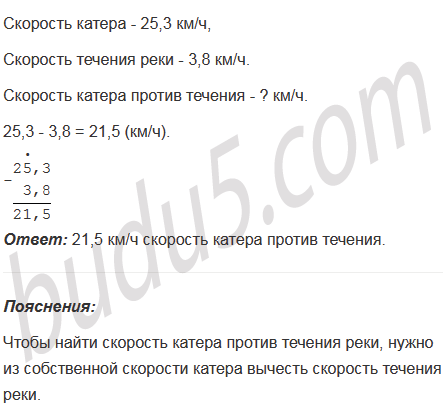 Собственная скорость катера равна 25,3 км/ч, а скорость течения реки 3,8 км/ч. Найдите скорость катера против течения реки.