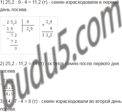 Для посева было приготовлено 25,2 т семян. В первый день на посев израсходовали
