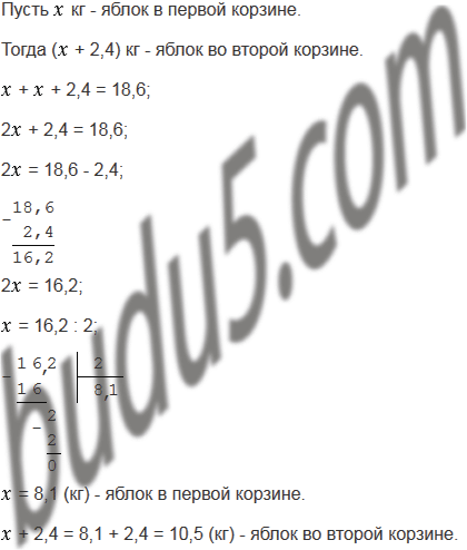 В двух корзинах 18,6 кг яблок. В первой корзине яблок на 2,4 кг меньше, чем во второй. Сколько килограммов яблок в каждой корзине?