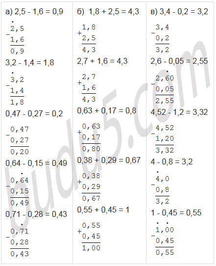 а) 2,5 - 1,6; б) 1,8 + 2,5; в) 3,4 - 0,2;